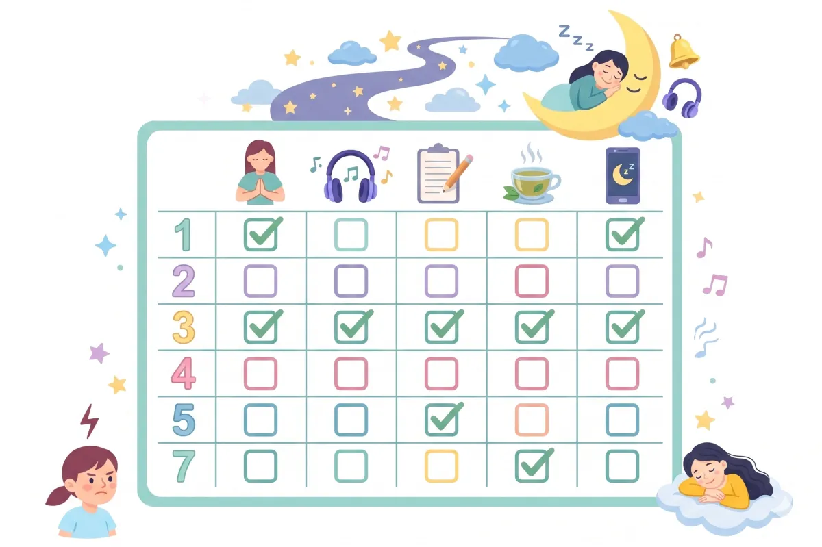 Jednoduchá tabulka, která ti pomůže sledovat tvůj pokrok a udržet si pravidelnost. Díky ní jasně uvidíš, jak se postupně zlepšuje tvůj klid i kvalita spánku.